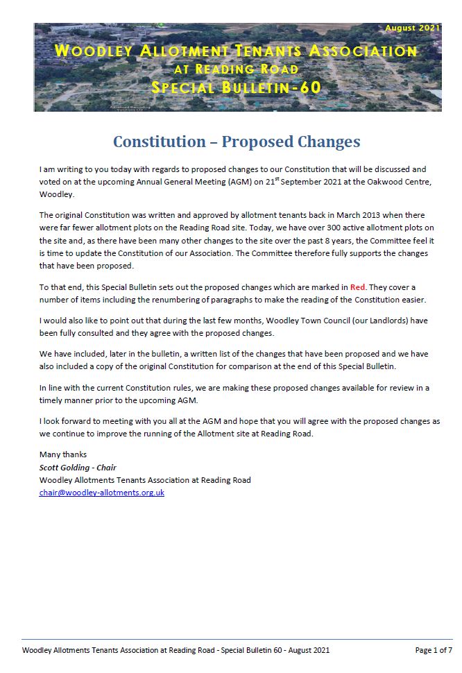 The Committee are please to announce the Draft Agenda for the upcoming Woodley Allotments Association at Reading Annual General Meeting (AGM) on the 21st September 2021 at The Oakwood Centre, Woodley at 7:30pm.