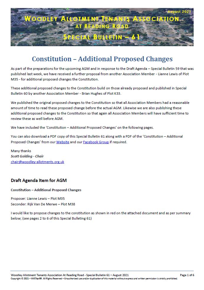 These additional proposed changes to the Constitution build on those already proposed and published in Special Bulletin 60 by another Association Member – Brian Hughes of Plot K33.