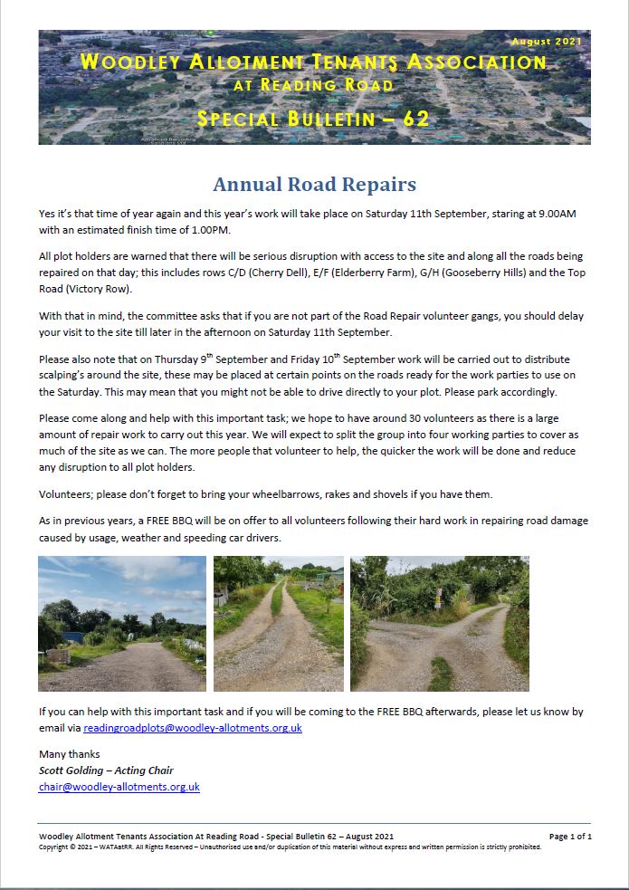 Yes it’s that time again!! Allotment road repairs are upon us and are scheduled for Saturday 11th September. There will be some disruption for traffic on site as we prepare before hand and during the work on the day.