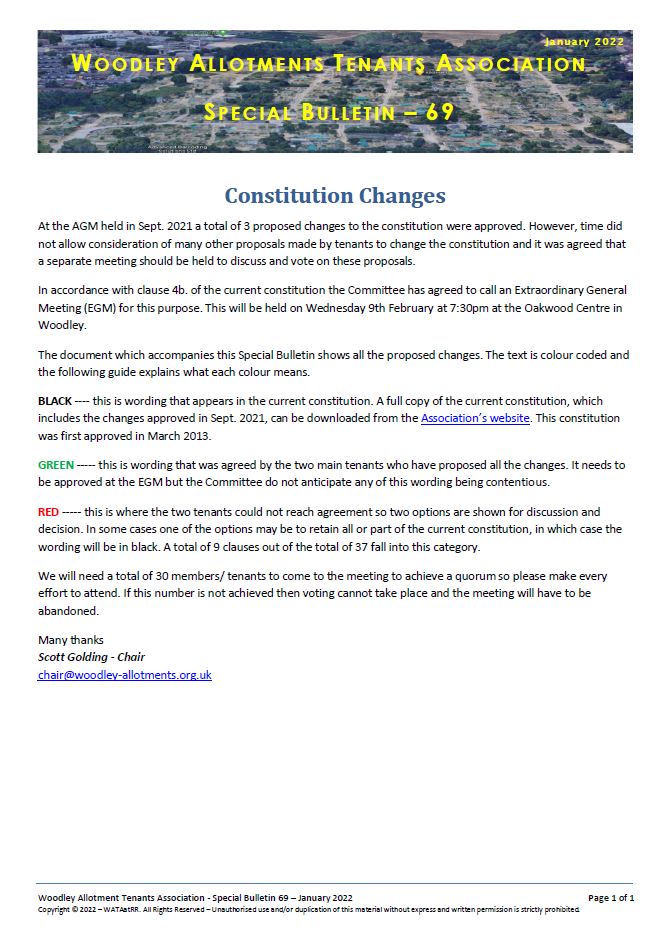 A quick reminder about the up-coming EGM scheduled for Wednesday 9th February 2022 at the Woodley Oakwood Centre at 7:30 pm to discuss changes to the Woodley Allotments Tenants Association Constitution.