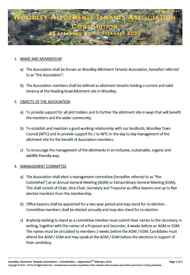 At an EGM held on 9th February 2022 at the Oakwood Centre, a revised Woodley Allotments Tenants Association Constitution was fully approved by members present.