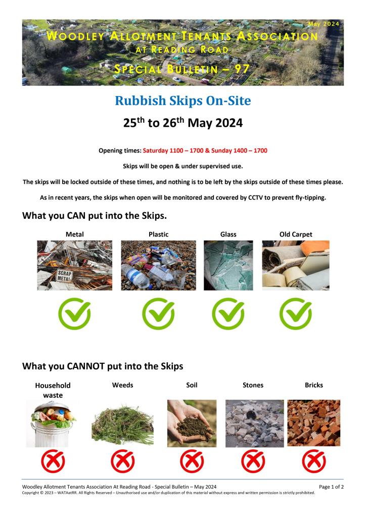 Special Bulletin 97 – Rubbish Skips On-Site – 25th to 26th May 2024 – Opening times: Saturday 1100 – 1700 & Sunday 1400 – 1700